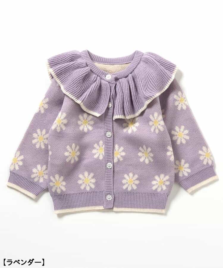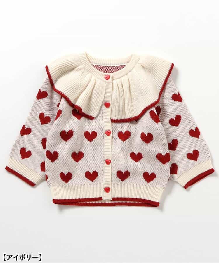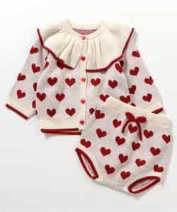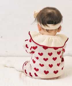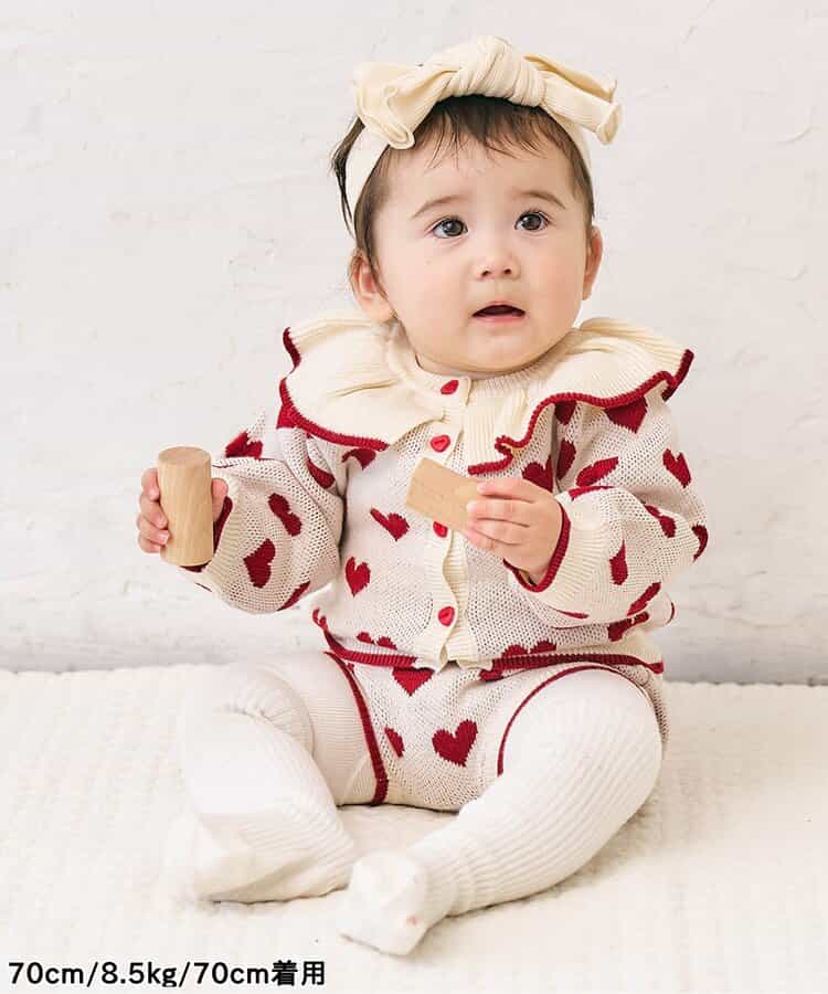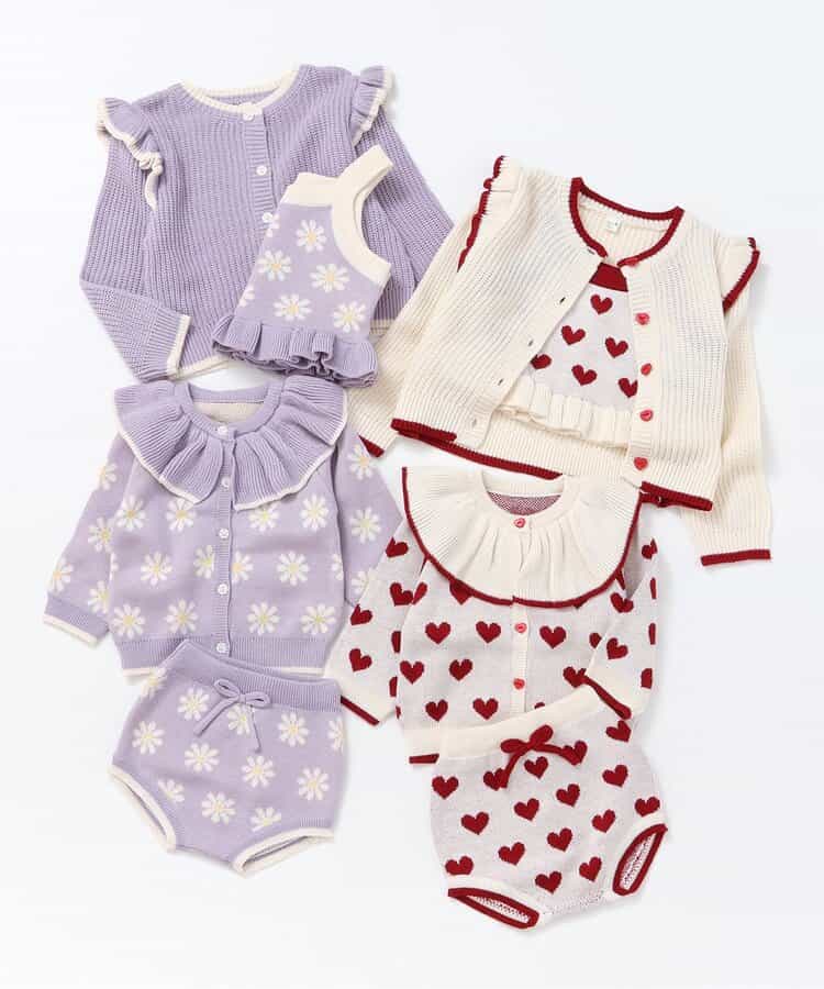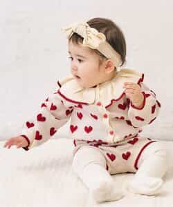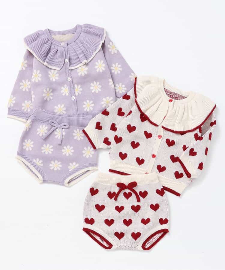apres les cours(アプレレクール)の「【リンク】ハート・フラワー衿フリルニットセットアップ」は、やさしいニュアンスのナチュラルなデザイン。ベビーギフトや出産祝いの主役にも♪