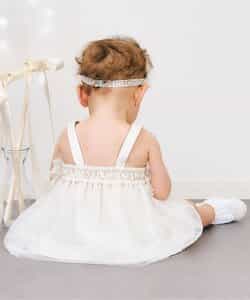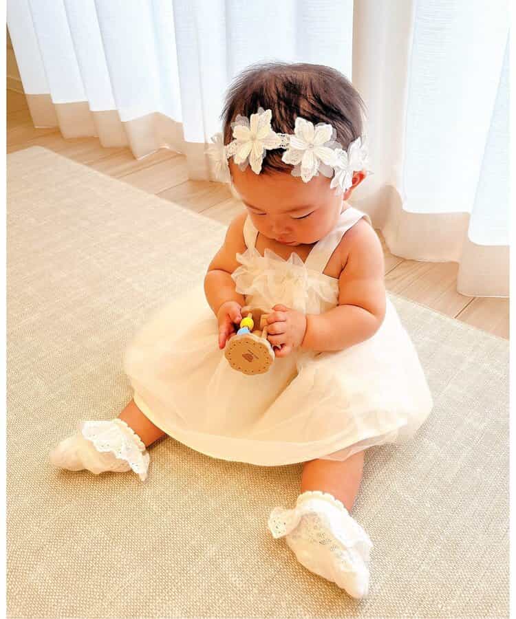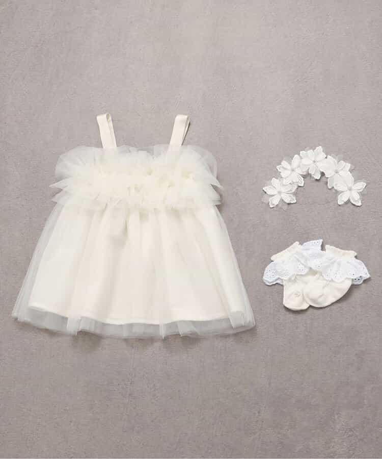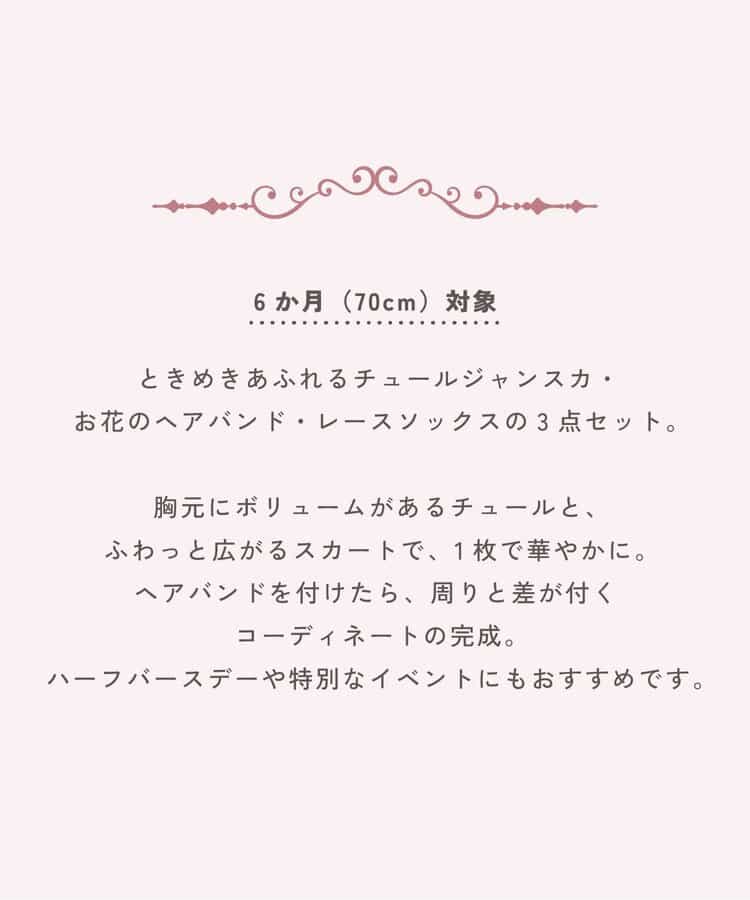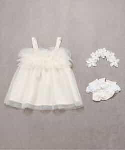 出産祝いにもおすすめの、ときめきあふれるチュールジャンスカ・お花のヘアバンド・レースソックスの3点セット。
