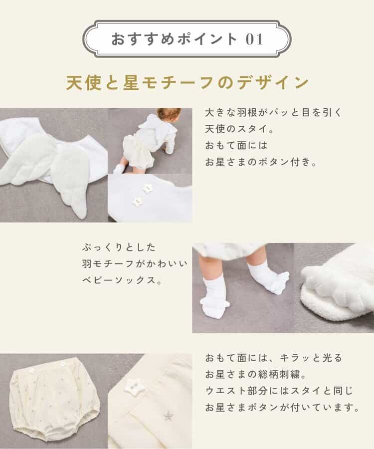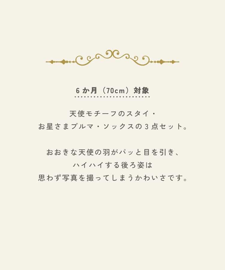 天使モチーフのスタイ・お星さまブルマ・ソックスの3点セット。