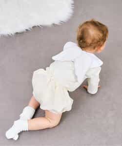 おおきな天使の羽がパッと目を引き、ハイハイする後ろ姿は思わず写真を撮ってしまうかわいさです。
