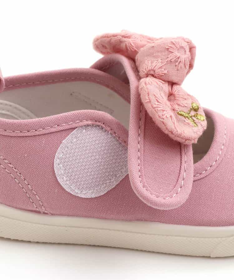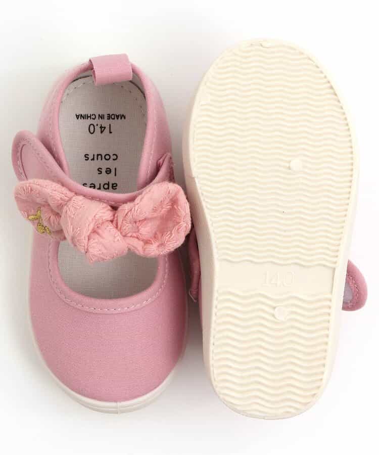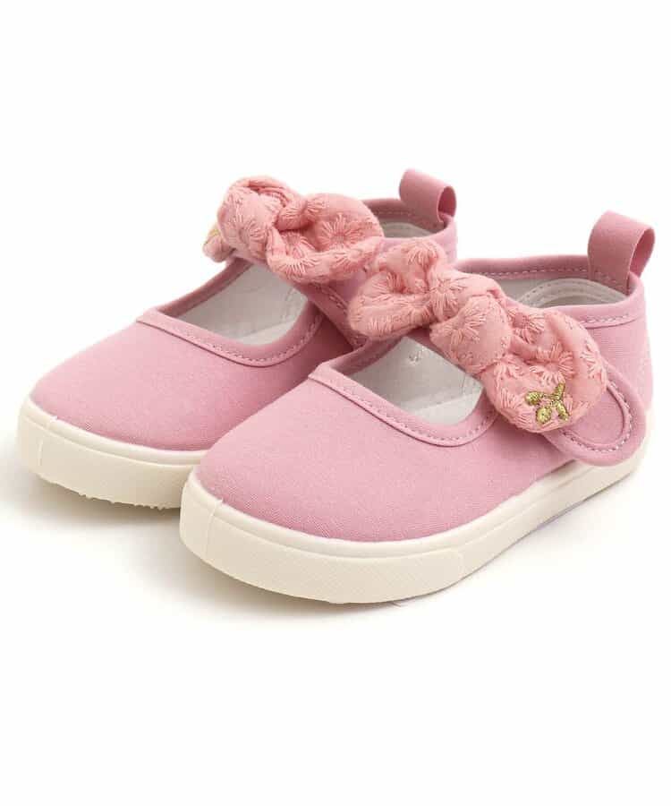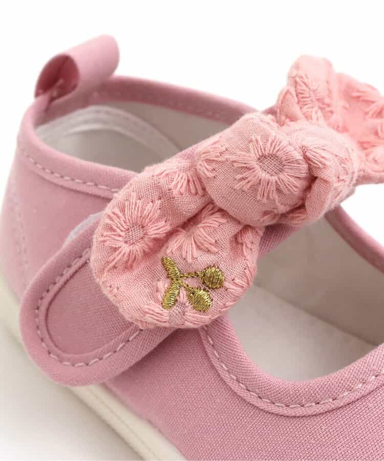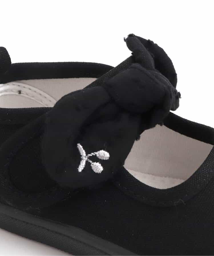 シンプルなデザインでリボンが特徴的なパンプス風のスニーカー♪リボンにはワンポイントでさくらんぼの刺繍入り♪*マジックテープ仕様なのでお子様でもスポッと簡単に着脱可能です◎
