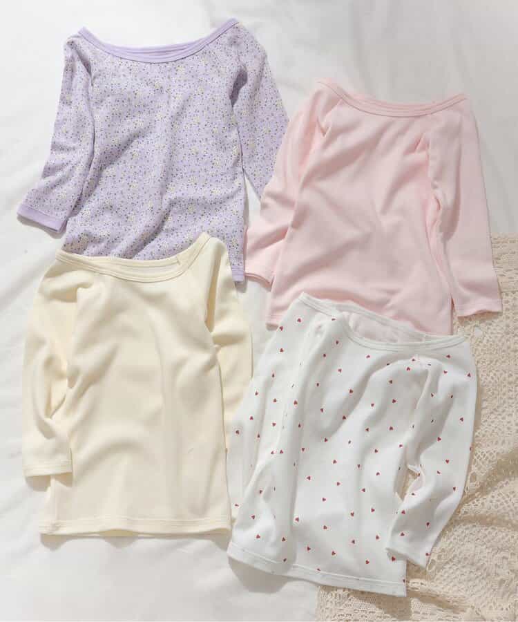 apres les cours(アプレレクール)の肌着「GIRLS深あき長袖肌着」は、手頃な価格とおしゃれなデザインが人気!毎日着るものだからかわいいインナーで♪