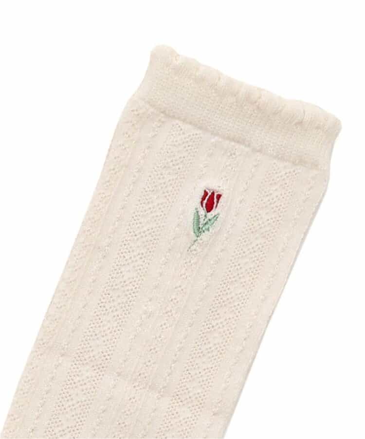 apres les cours(アプレレクール)のタイツ・ソックス「お花刺繍ハイソックス」は、足元からおしゃれになれるデザイン。おようふくとのスタイリングも楽しんで。靴下のSS・S・10-12cm・13-15cm、タイツの70-80cm・80-90cm・90-100cmには基本的に靴下に滑り止め加工がございます。(一部除外あり)