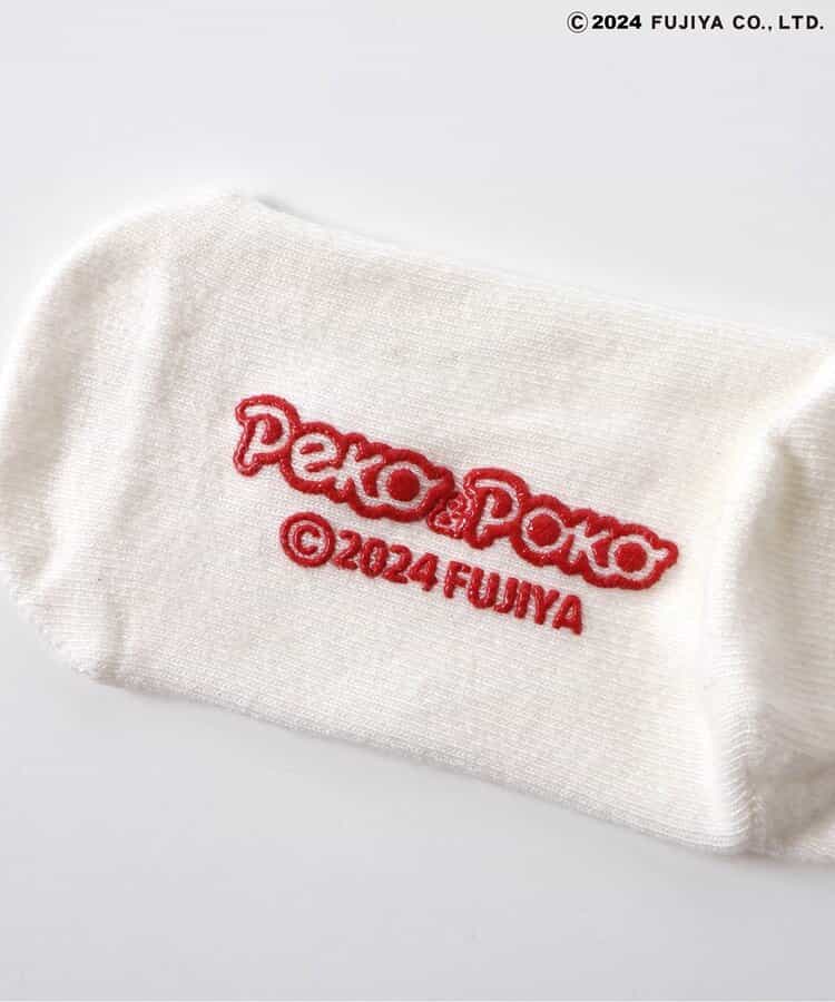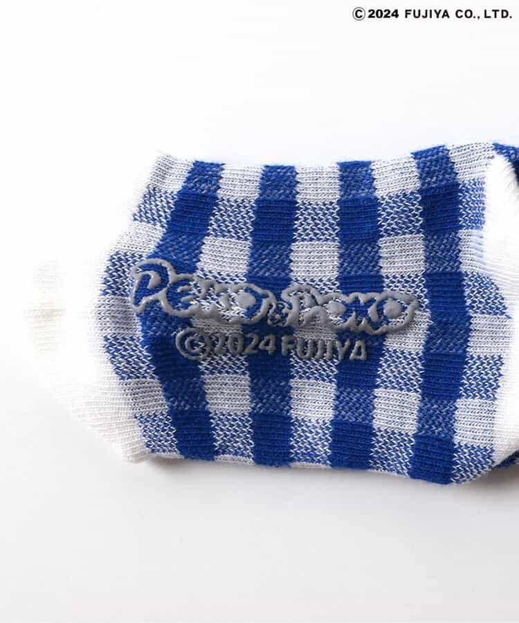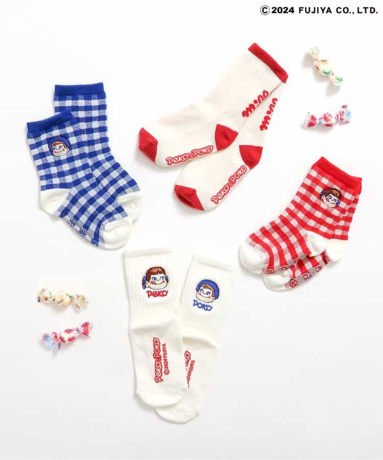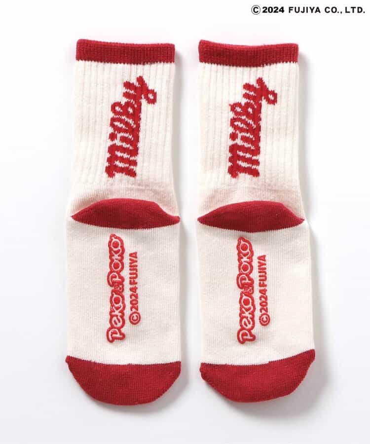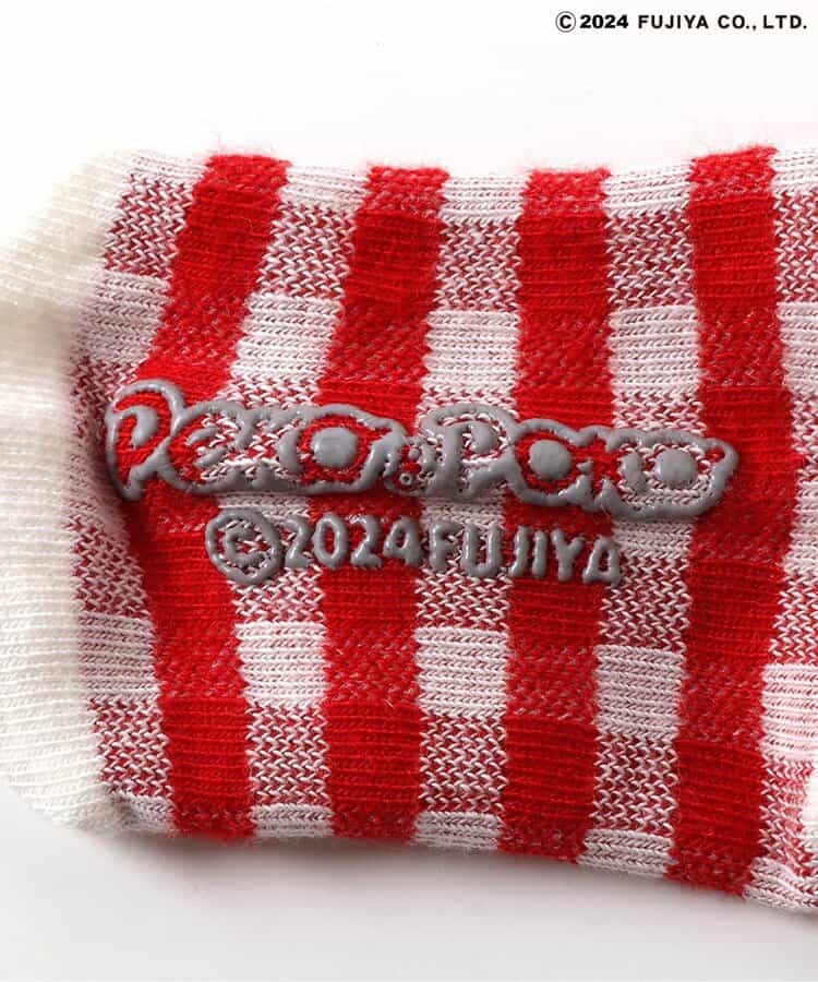 デザインが異なる4色展開。レッド:赤のギンガムチェックにペコちゃんが刺繍されています。ブルー:青のギンガムチェックにポコちゃんが刺繍されています。アイボリー:白ベースの後ろ部分に、ペコちゃんとポコちゃんが片足ずつ刺繍されています。レッドとブルーに比べ刺繍部分のデザインは少し大きいです。オフホワイト:後ろにミルキーのロゴがプリントされています。どのカラーも転倒防止対策として、足裏部分に「PEKO&POKO」ロゴの滑り止めが付いています。スニーカーだけでなく、パンプスやブーツなどと合わせてもご利用いただけます♪