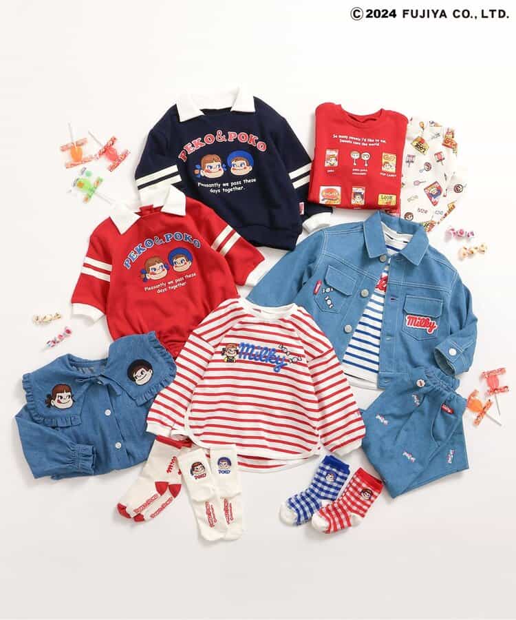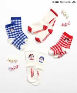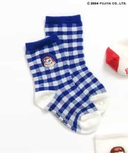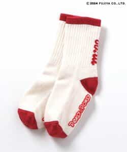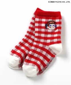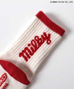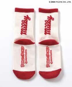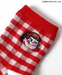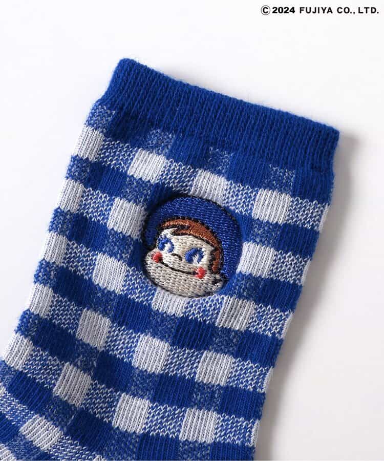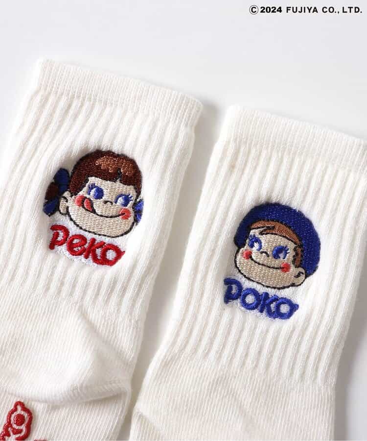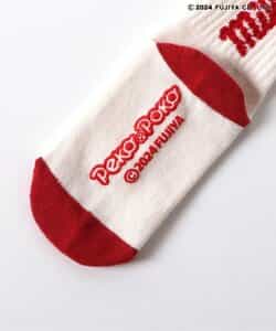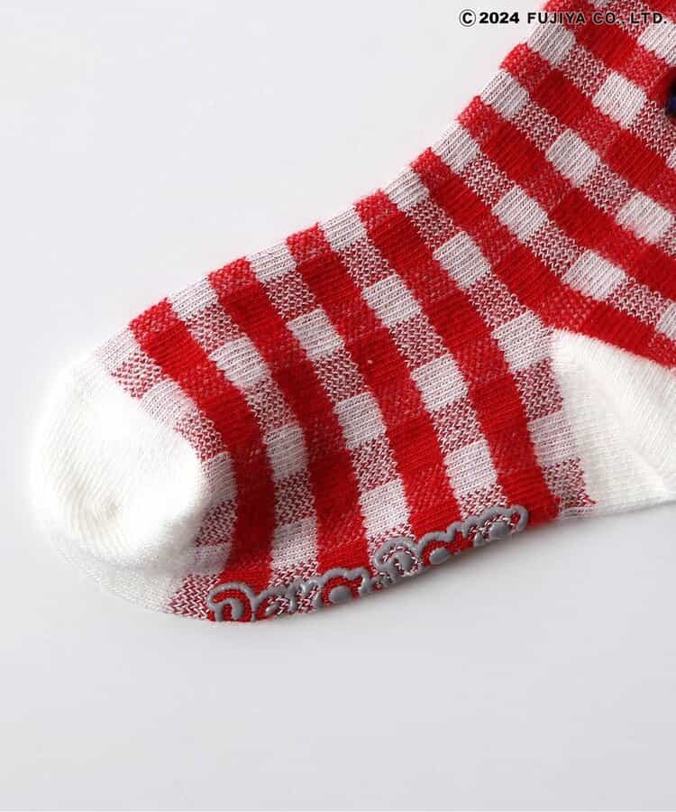 デザインが異なる4色展開。レッド:赤のギンガムチェックにペコちゃんが刺繍されています。ブルー:青のギンガムチェックにポコちゃんが刺繍されています。アイボリー:白ベースの後ろ部分に、ペコちゃんとポコちゃんが片足ずつ刺繍されています。レッドとブルーに比べ刺繍部分のデザインは少し大きいです。オフホワイト:後ろにミルキーのロゴがプリントされています。どのカラーも転倒防止対策として、足裏部分に「PEKO&POKO」ロゴの滑り止めが付いています。スニーカーだけでなく、パンプスやブーツなどと合わせてもご利用いただけます♪