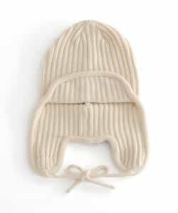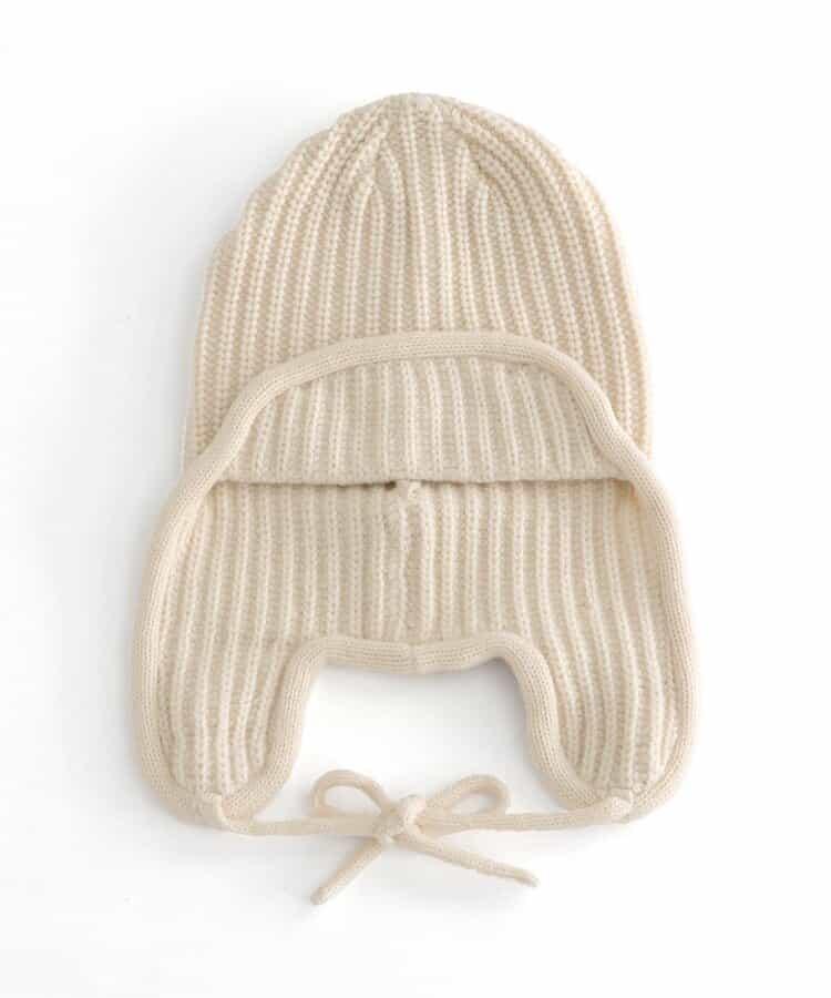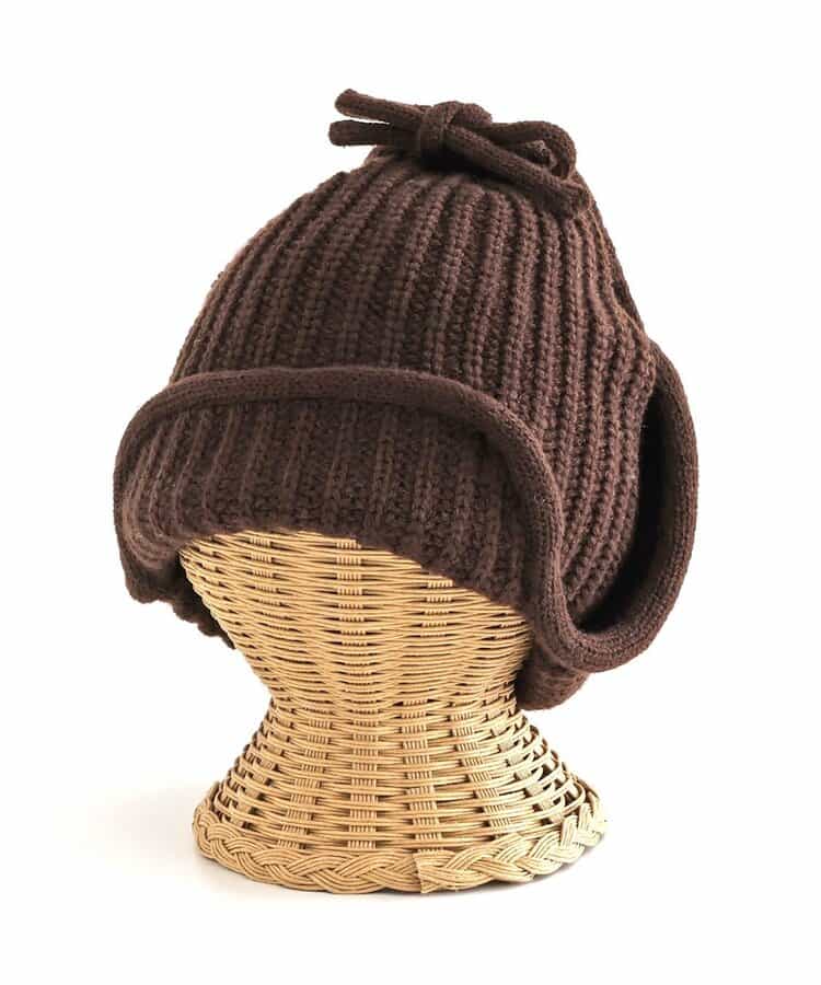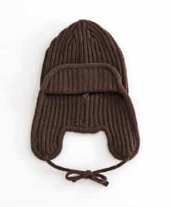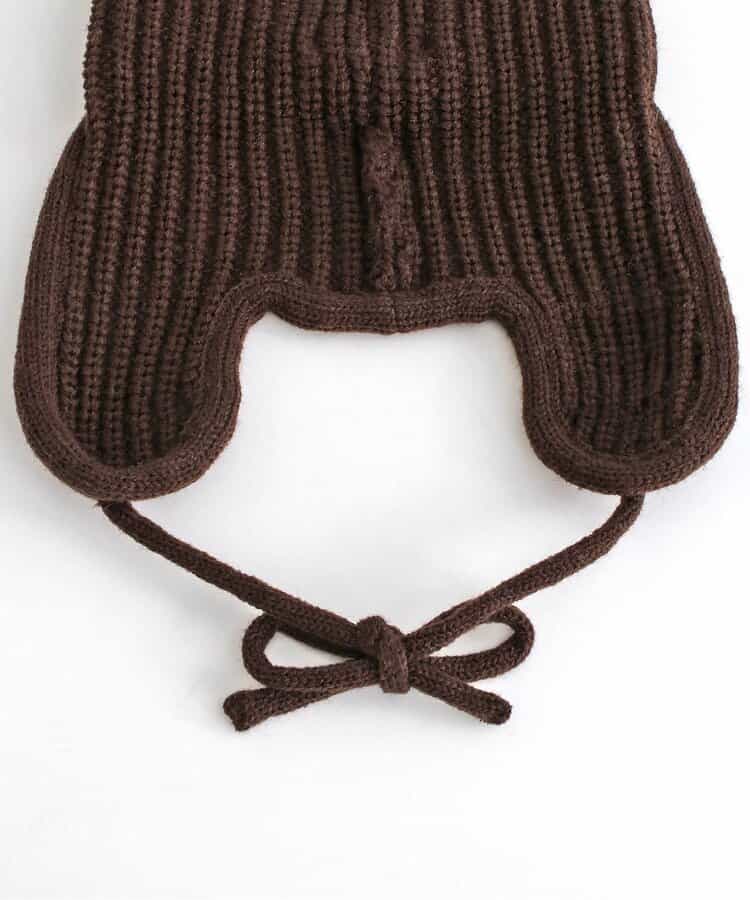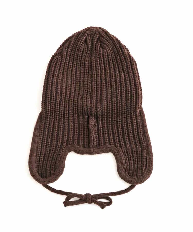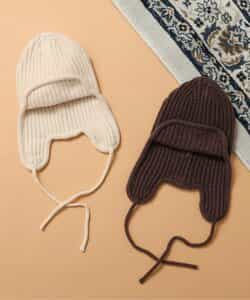 オシャレであたたかい!!耳当て付きのフライトキャップ*耳当てを上げて頭頂部で紐を結ぶとお洒落さん!耳当てを降ろしてあご紐を結ぶと暖かい♪色んな被り方が出来るニット帽です。優しいカラーのアイボリーとブラウンの2色展開*