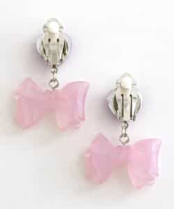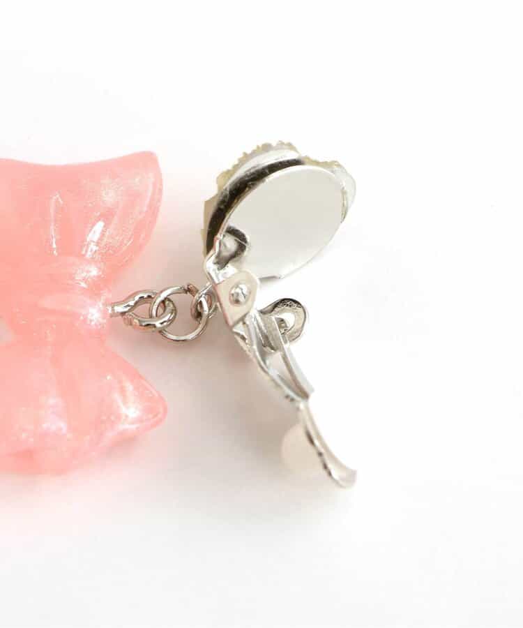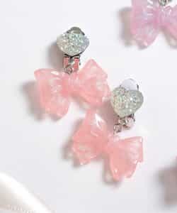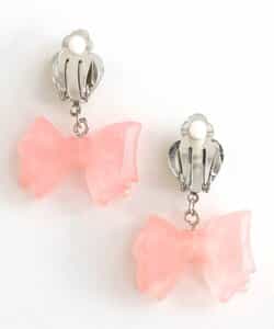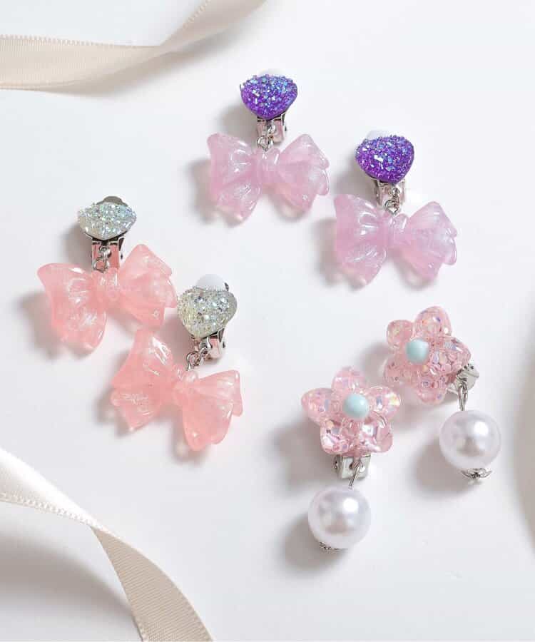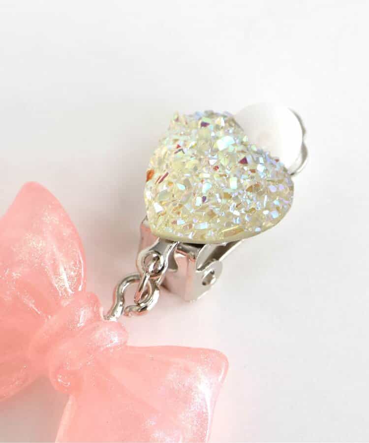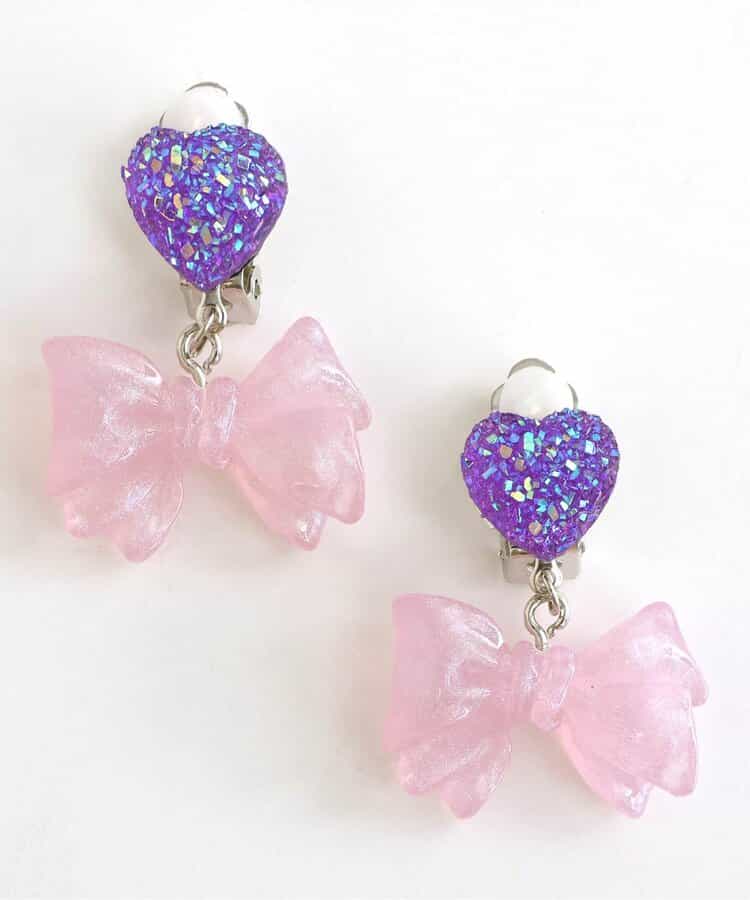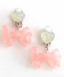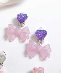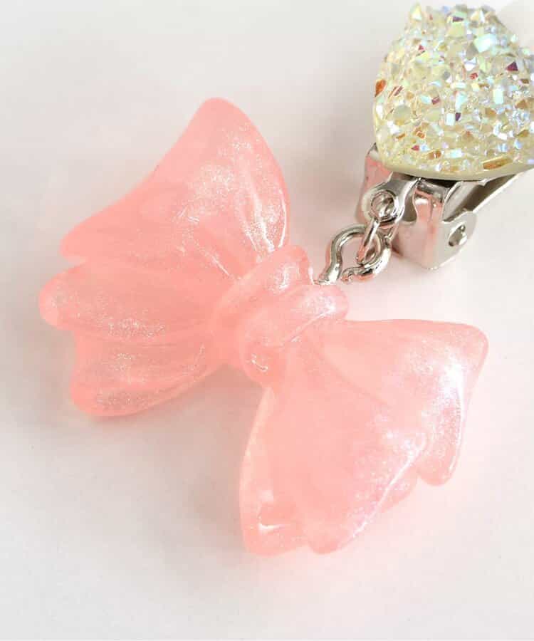 キラキラのハートビジューに、クリア素材のキラキラリボンモチーフがキュートなイヤリング♪女の子人気が高いピンクとラベンダーの2色をラインナップ。お姫様みたいなガーリーなお洋服との相性抜群◎女の子の気分が上がる可愛いアクセサリーです。