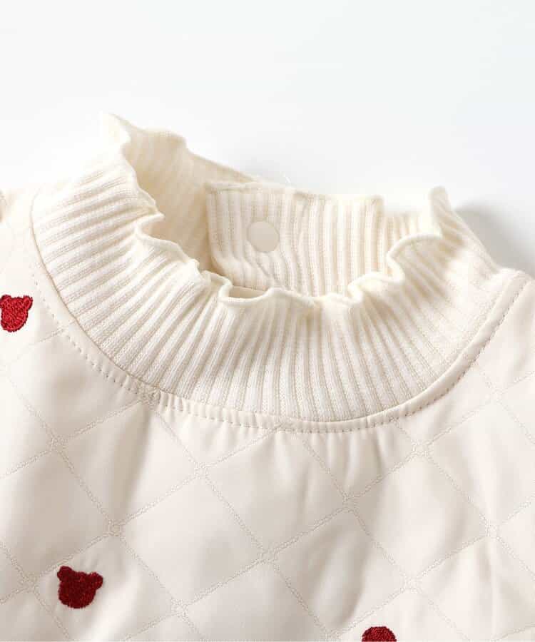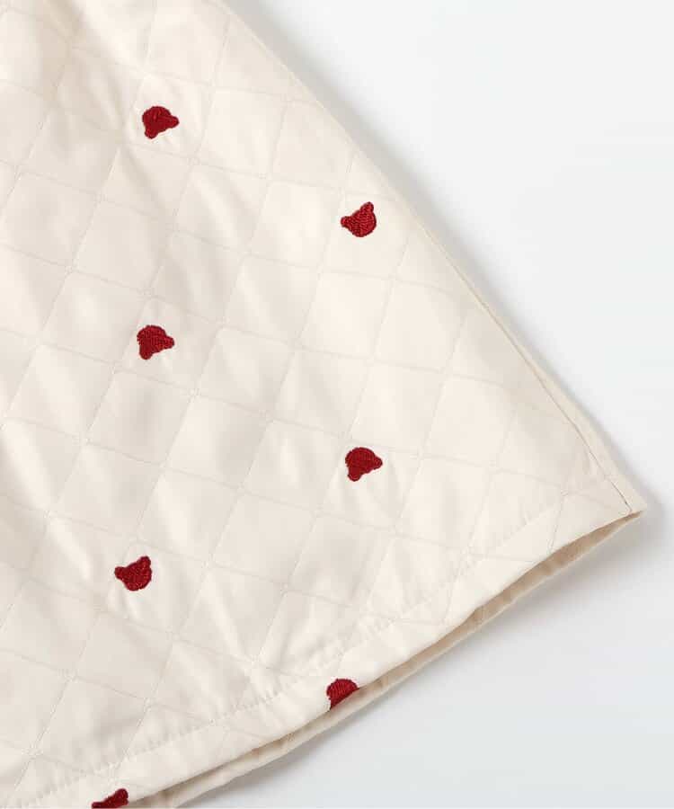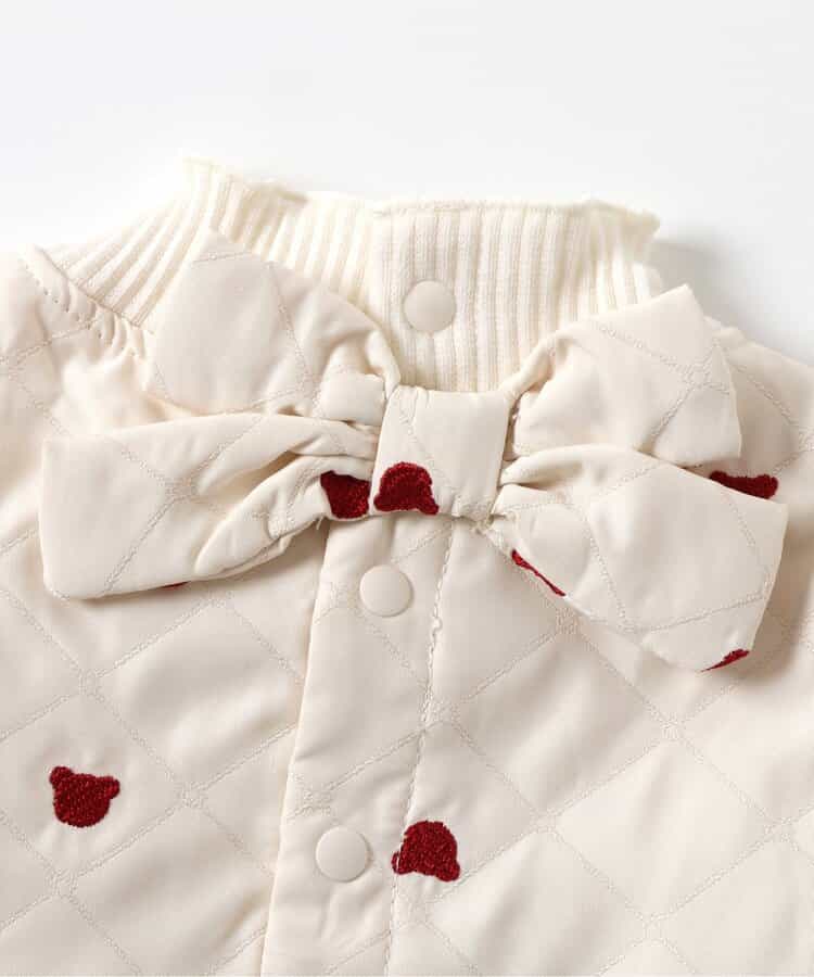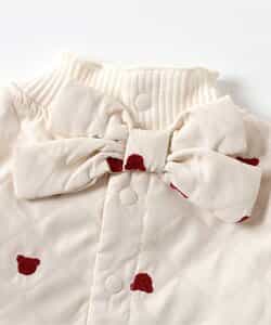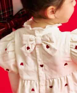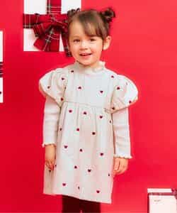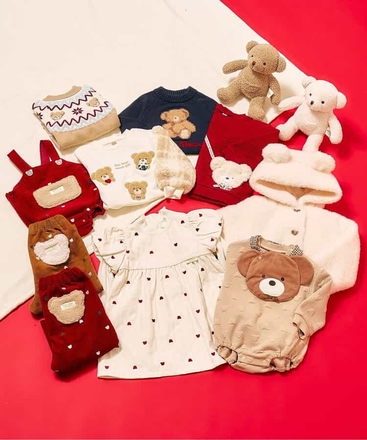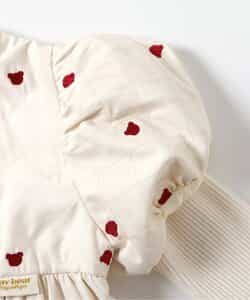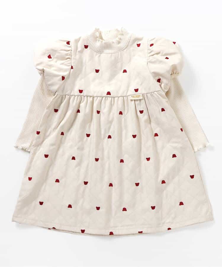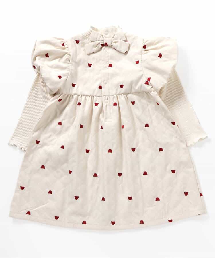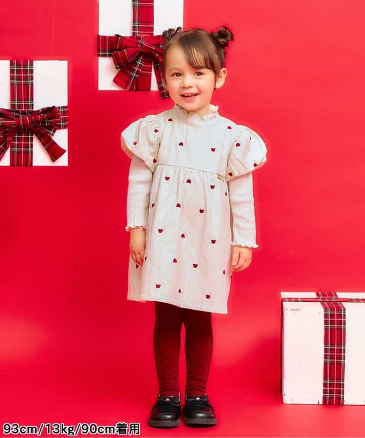 ≪tiny bearクリスマスコレクション≫tiny bearの総柄がアクセントになったクリスマスにおすすめのワンピース。重ね着風の袖はぽわんとしたシルエットで、華やかに。背中部分にもおおきなリボンがついて、バックスタイルまでおしゃれ。パーティーやおでかけなど、おめかしコーデにぴったりです♪ボトムとリンクコーデもおすすめ!