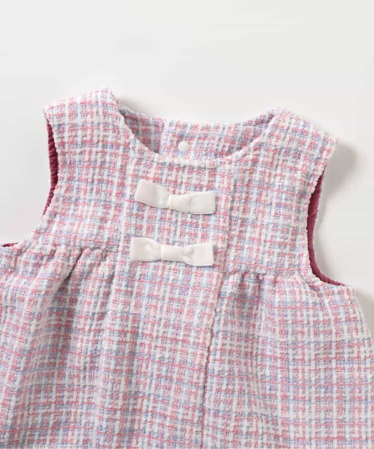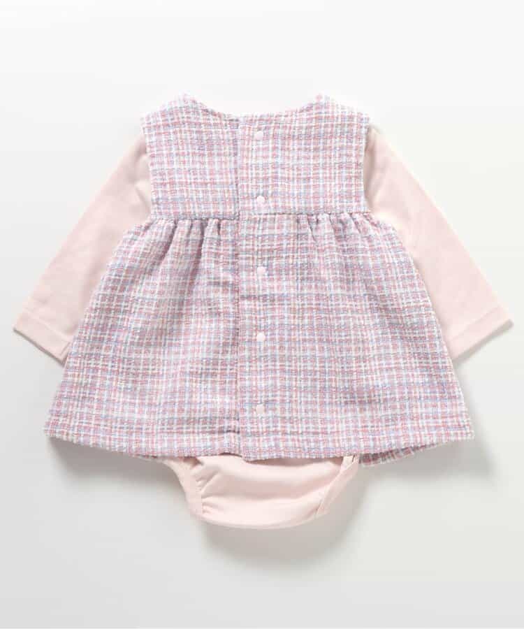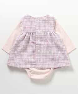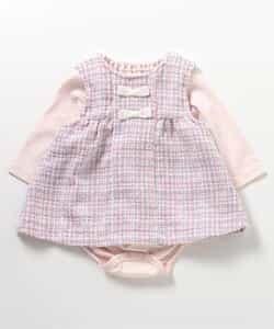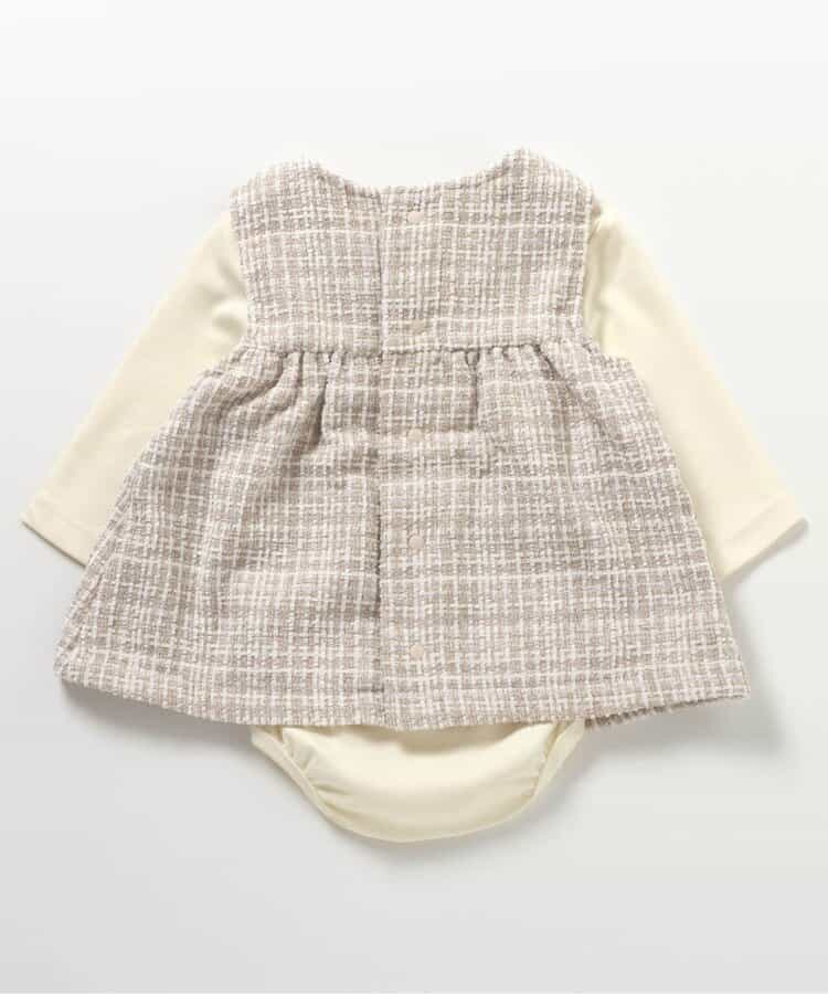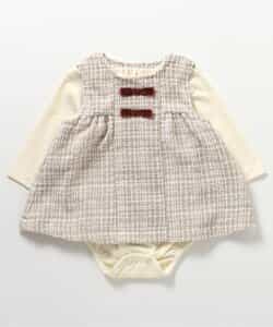apres les cours(アプレレクール)の「ジャンスカ+ボディースーツセット」は、やさしいニュアンスのナチュラルなデザイン。ベビーギフトや出産祝いの主役にも♪