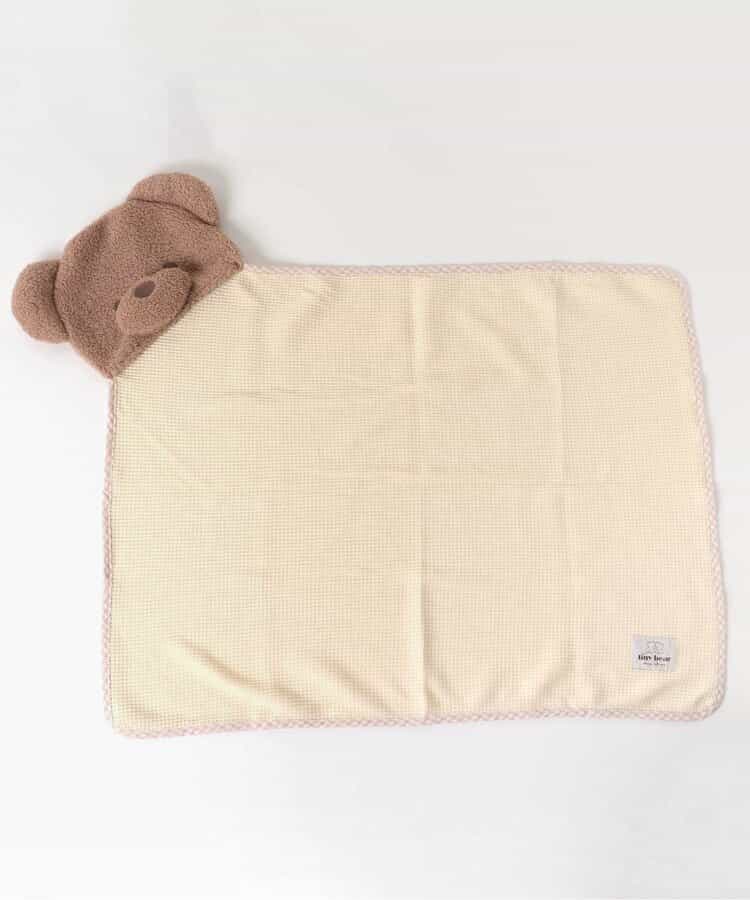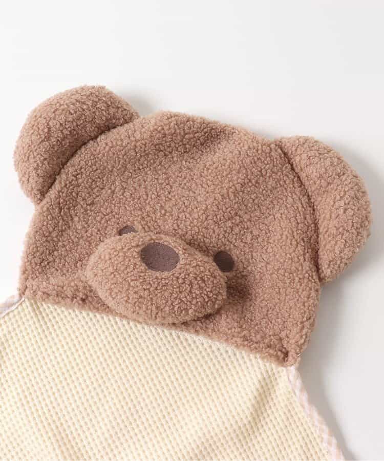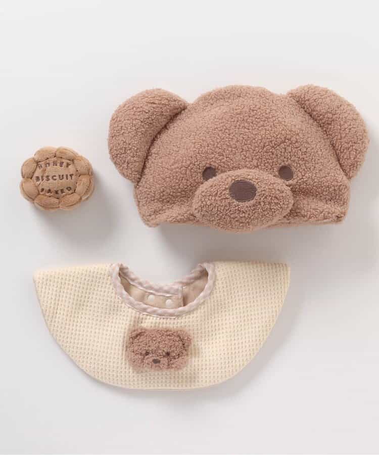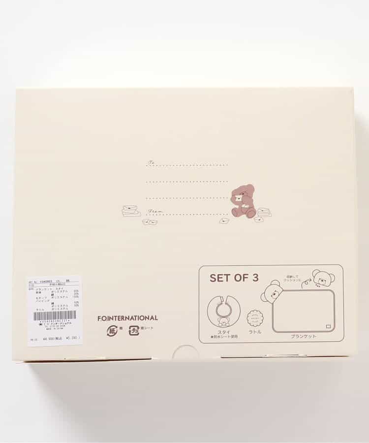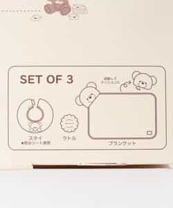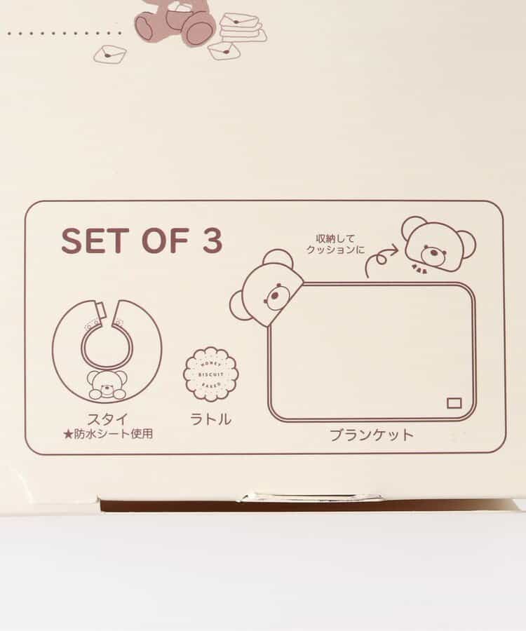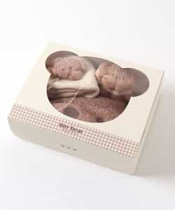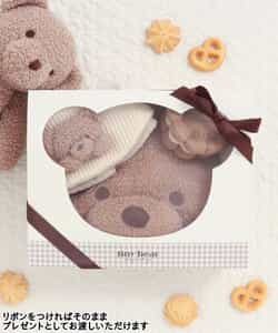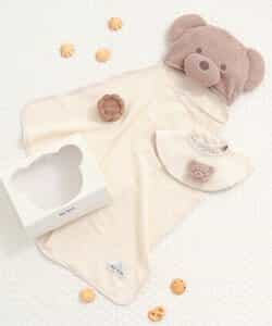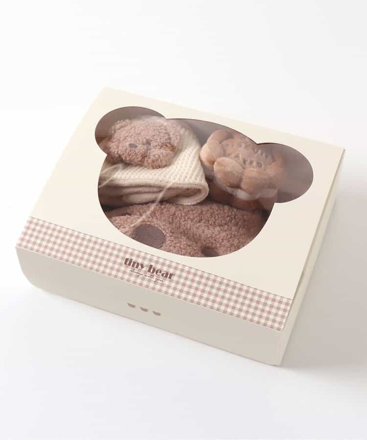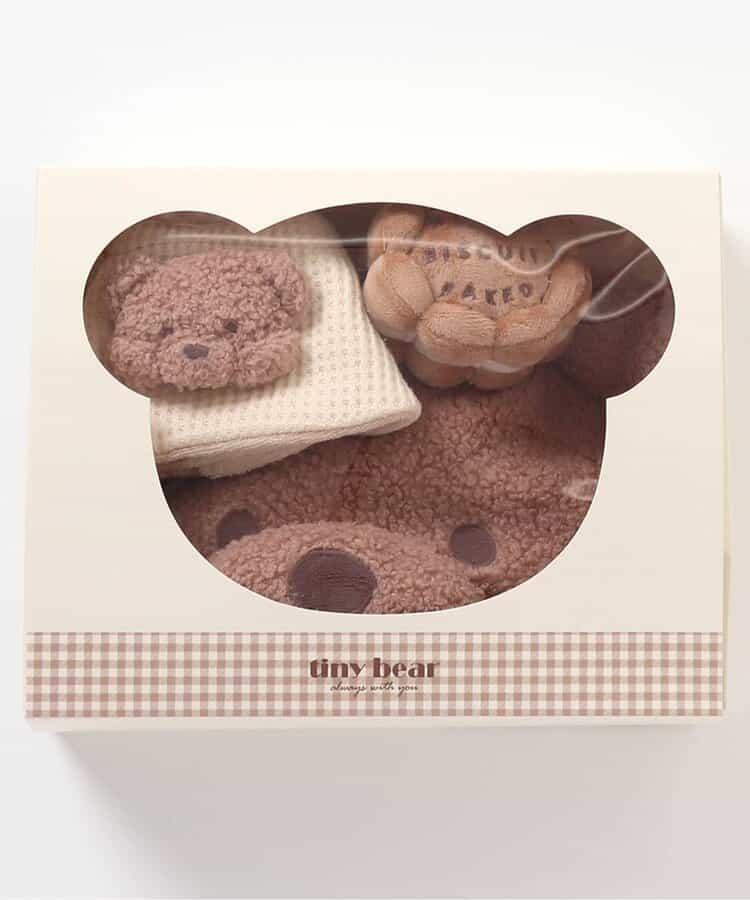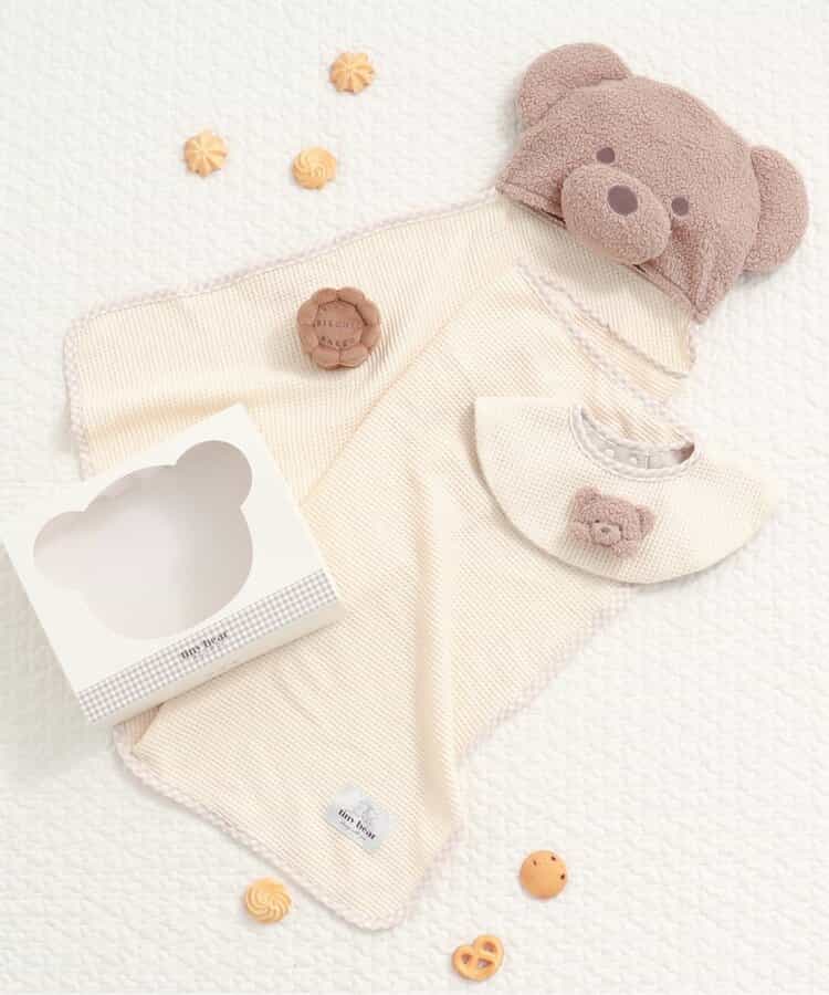 「お母さんから赤ちゃんへの初めてのプレゼント」。スタイ・ラトル・ブランケットの3点が入ったギフトセット。ブランケットはワッフル素材で通年使えて、tiny bearのお顔部分にブランケットを収納してクッションにもなる便利な1枚。立体的なもこもこのtiny bearがかわいいワッフル素材のスタイと、tiny bearが大好きなビスケットの形をした鈴入りラトルも。tiny bearのお顔が見える、ラッピングの箱もとってもキュート!箱の後ろにはメッセージ欄もご用意しているので、出産祝いにもおすすめ◎喜ばれること間違いなし♪