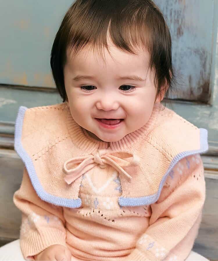 apres les cours(アプレレクール)のスタイ・エプロン「ニットベビーつけ衿」は、おようふくとのスタイリングも楽しめるデザインで、ベビーギフトや出産祝いにもおすすめ*