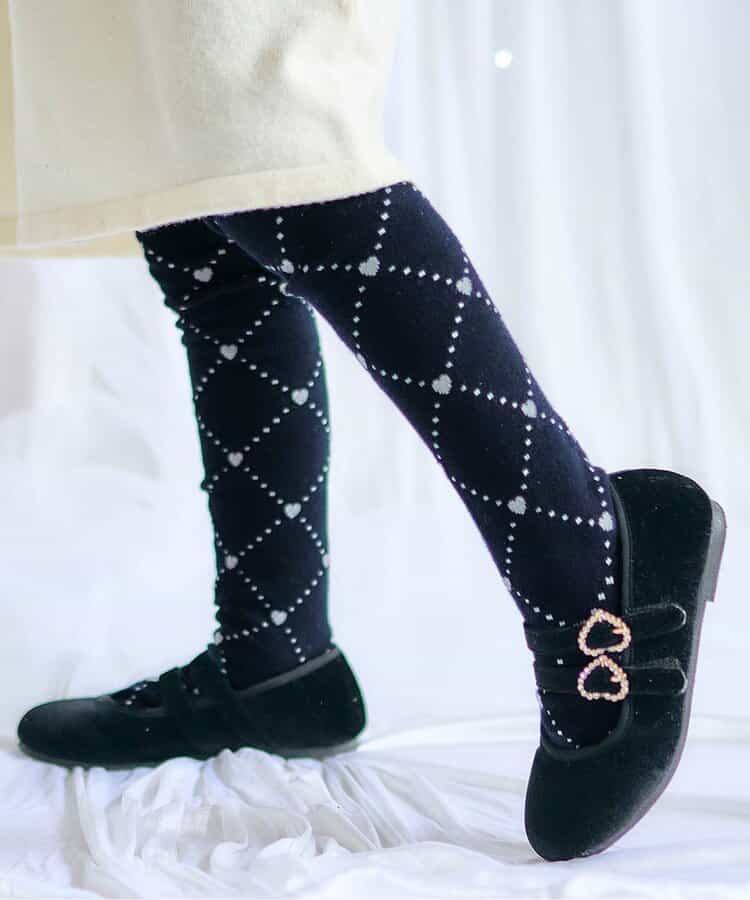 apres les cours(アプレレクール)のタイツ・ソックス「リボン・ハート柄タイツ」は、足元からおしゃれになれるデザイン。おようふくとのスタイリングも楽しんで。靴下のSS・S・10-12cm・13-15cm、タイツの70-80cm・80-90cm・90-100cmには基本的に靴下に滑り止め加工がございます。(一部除外あり)