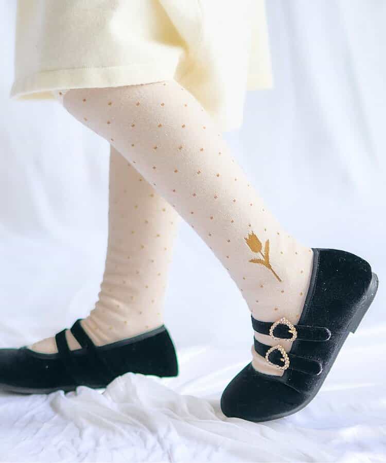 apres les cours(アプレレクール)のタイツ・ソックス「チューリップモチーフドットタイツ」は、足元からおしゃれになれるデザイン。おようふくとのスタイリングも楽しんで。靴下のSS・S・10-12cm・13-15cm、タイツの70-80cm・80-90cm・90-100cmには基本的に靴下に滑り止め加工がございます。(一部除外あり)